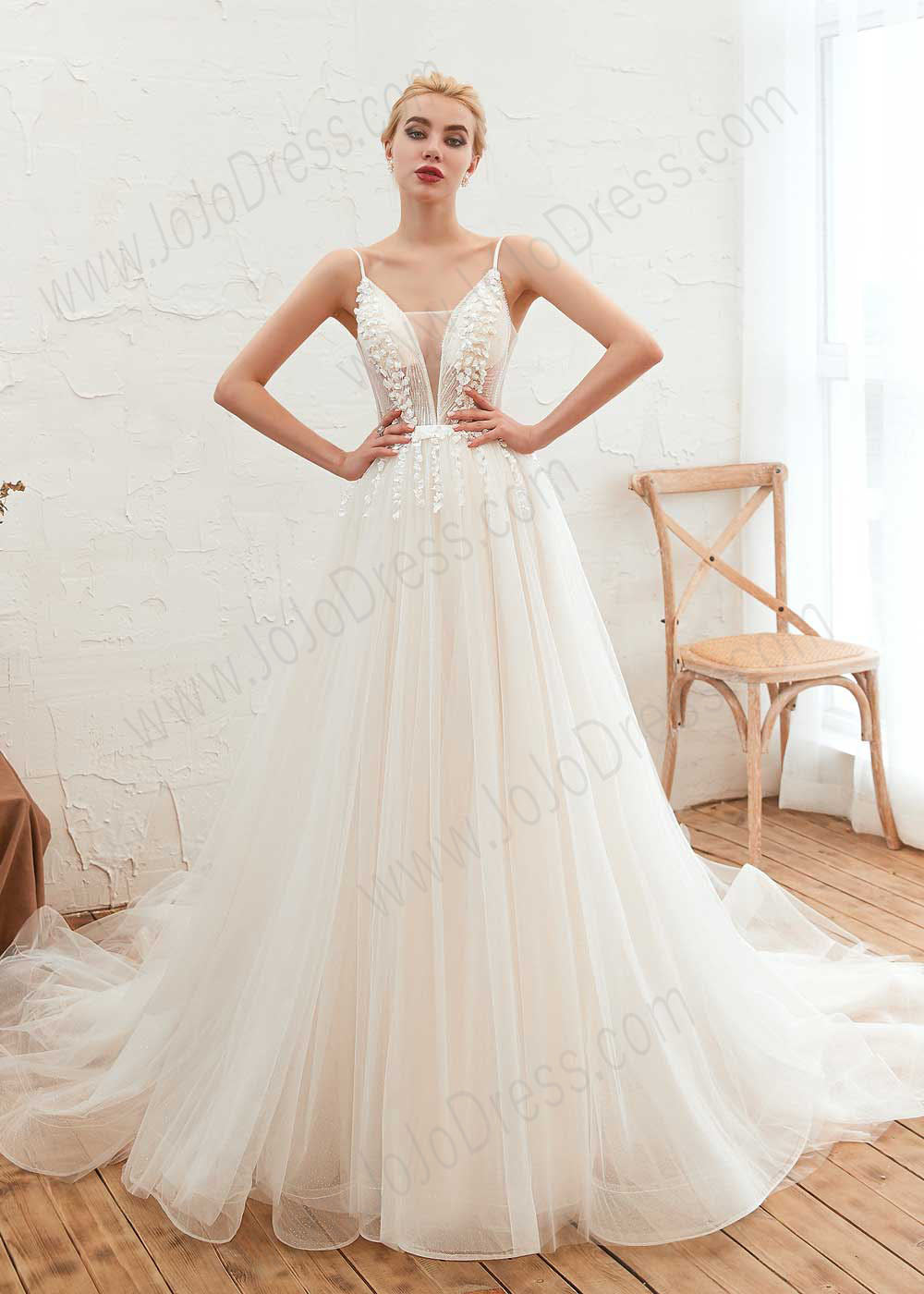 Beautiful boho style lace ball gown Dress with illusion neckline and a low open back.