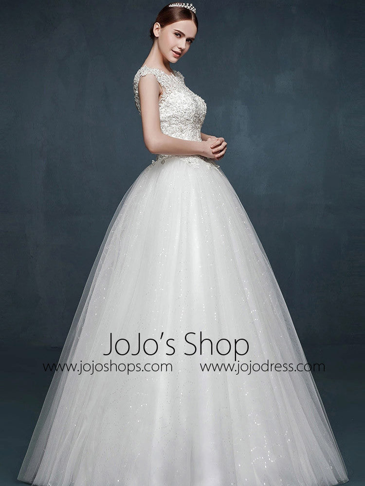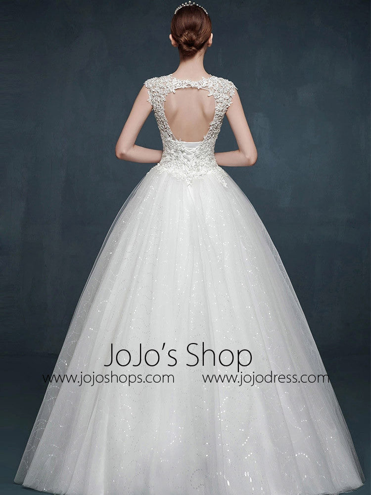 Beautiful lace keyhole open back A-line Dress with sparkly tulle skirt and beaded lace bodice.