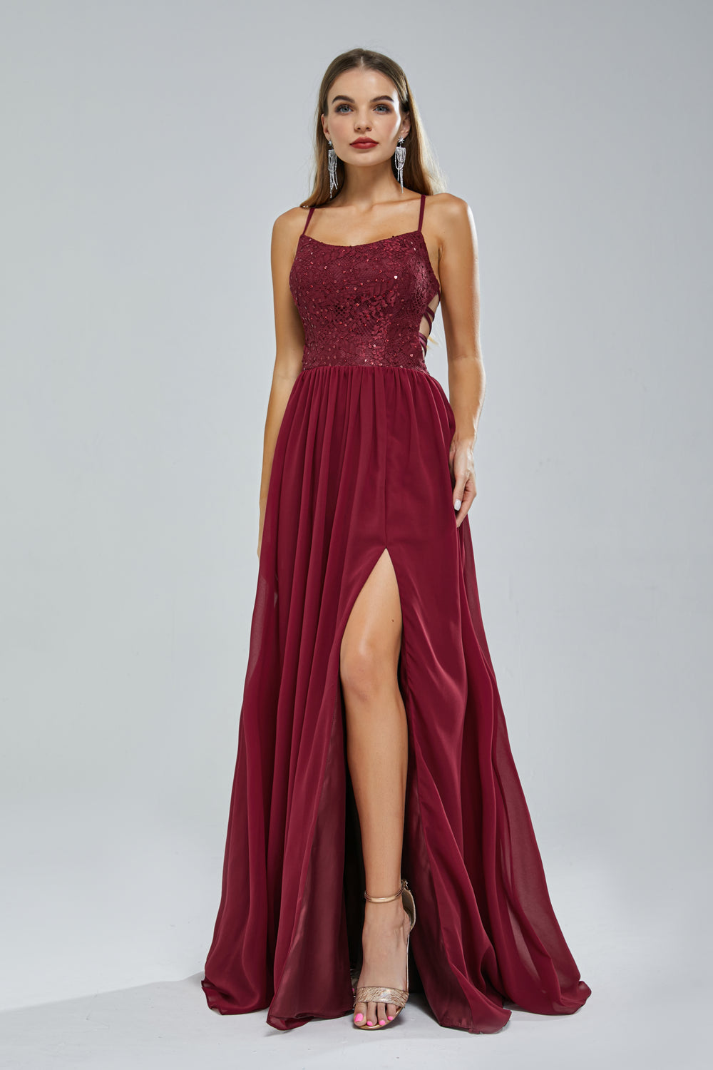 Sexy long maxi formal prom dress with silt and open crisscross back. Photo taken in Peach, but can also be customized in another color.