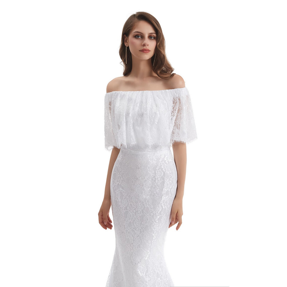 Step out of your comfort zone with the Off the Shoulder Lace Mermaid Wedding Dress EN4808. This eye-catching boho lace wedding dress features an off the shoulder lace design and an ultra romantic ruffle neckline, perfect for brides looking for a unique destination or beach wedding look. Feel confident and beautiful in this one-of-a-kind wedding dress.