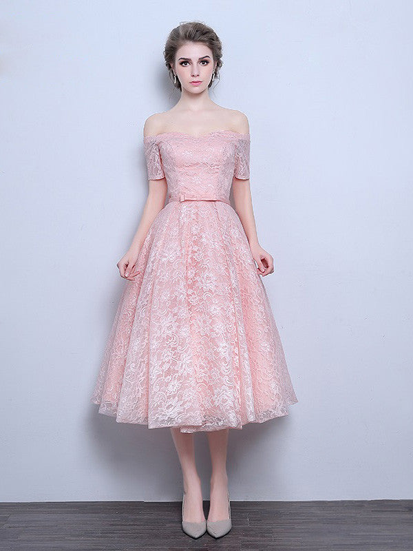 Retro lace tea length dress with off shoulder sleeves, finished with a cute bow tie sash.